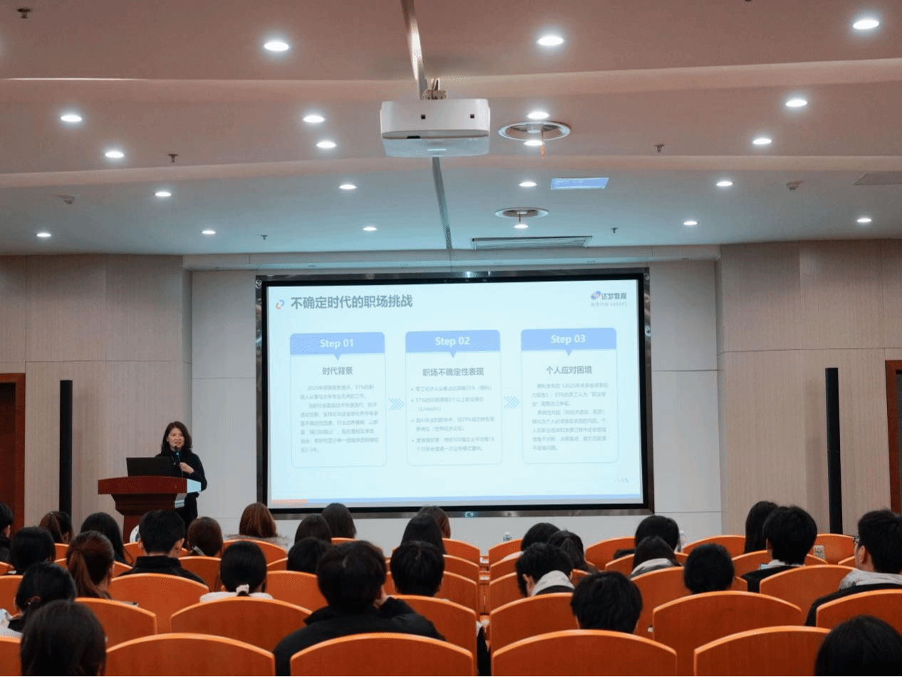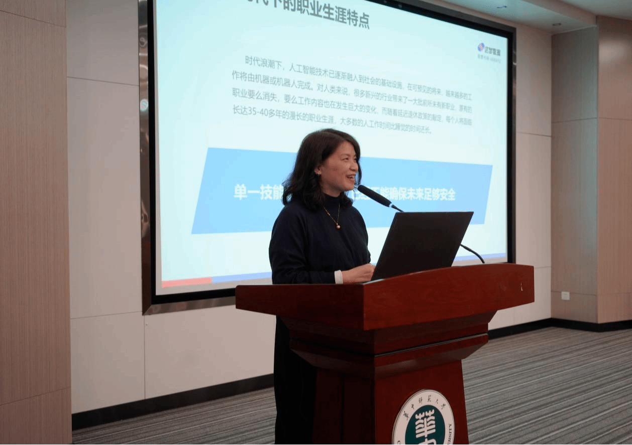 “我也是从技术走向管理,最后在人力资源领域深耕下来的。”讲座伊始,张瑾从自身跨界多元经历切入,直指当下就业环境的核心变化,即技术迭代加速、行业边界模糊,单一技能已无法确保职业安全。她提出,在不确定时代,个人需要构建“动态核心能力”,重新审视并规划自我发展路径,以应对变化。