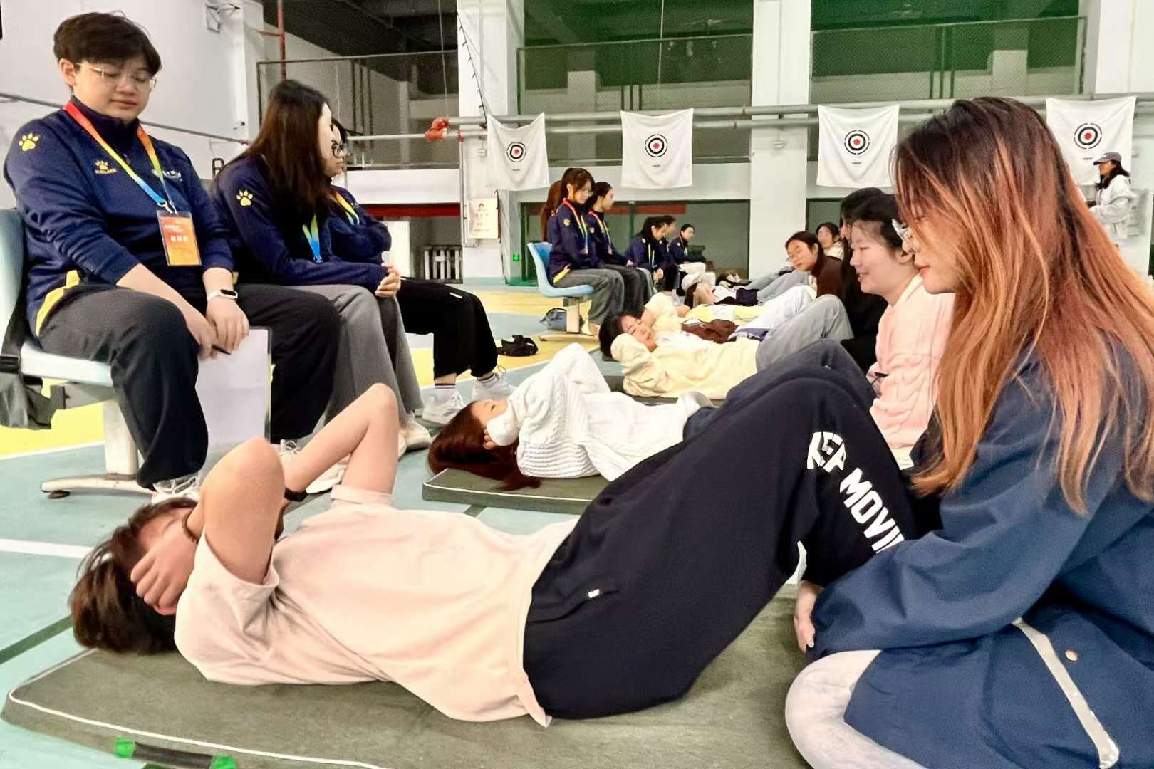11月1日上午,女子仰卧起坐项目于佑铭体育馆如火如荼地进行。信管的选手们已在垫子上准备就绪,双手紧扣脑后。哨声一响,她们将身体迅速而有力地抬起,背部形成一道道有力的曲线。随着时间慢慢流逝,体力渐渐耗尽,但她们更加努力起来。她们每一次挺起,都在诉说突破自我的决心,都在诠释对团队那份沉甸甸的责任。