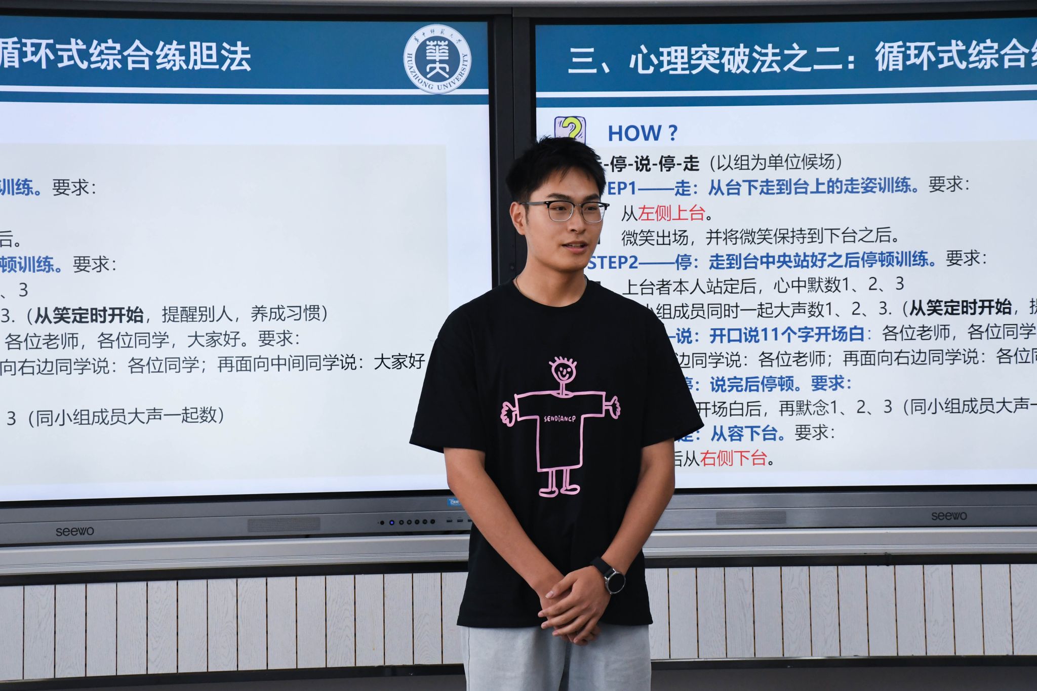 针对大家普遍存在的表达焦虑,课程特别设计了心理建设模块。陈老师用专业知识告诉同学们,公众表达焦虑是人之常情,适度紧张甚至能转化为表达的强劲动力。随后,“三定法” 心理突破技巧重磅登场:通过发音练习强化面部表情控制的 “笑定”,采用分组对视训练提升眼神交流能力的 “眼定”,结合肢体语言稳定台风的 “站定”,为同学们搭建起一套科学实用的表达心理训练体系。此外,标准化实训流程贯穿课堂,三轮分组实战层层递进,助力同学们实现从紧张局促到从容自信的华丽蜕变。
