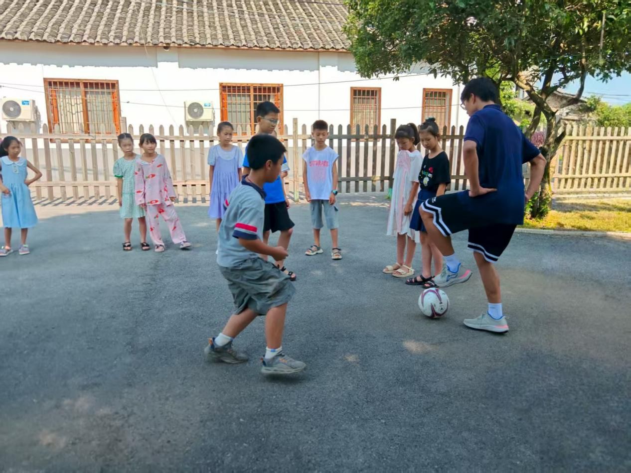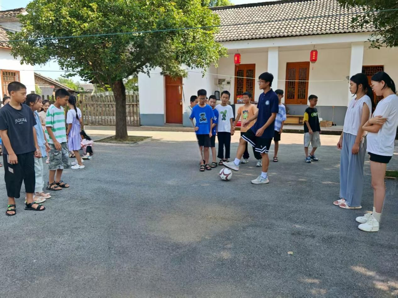 华大青年讯(通讯员 潘忻宏 刘宇彤)为提升赵李桥镇“爱心托管班”学生的身体素质与综合素养,华中师范大学信息管理学院追光实践队赤壁分队于7月12日为托管班的孩子们带来足球小课堂与八段锦教学等体育课程。该活动旨在通过多样化、趣味化的运动训练,帮助学生们增强体能、培养团队协作意识,同时了解中华优秀传统文化,助力 “德智体美劳” 五育融合发展。