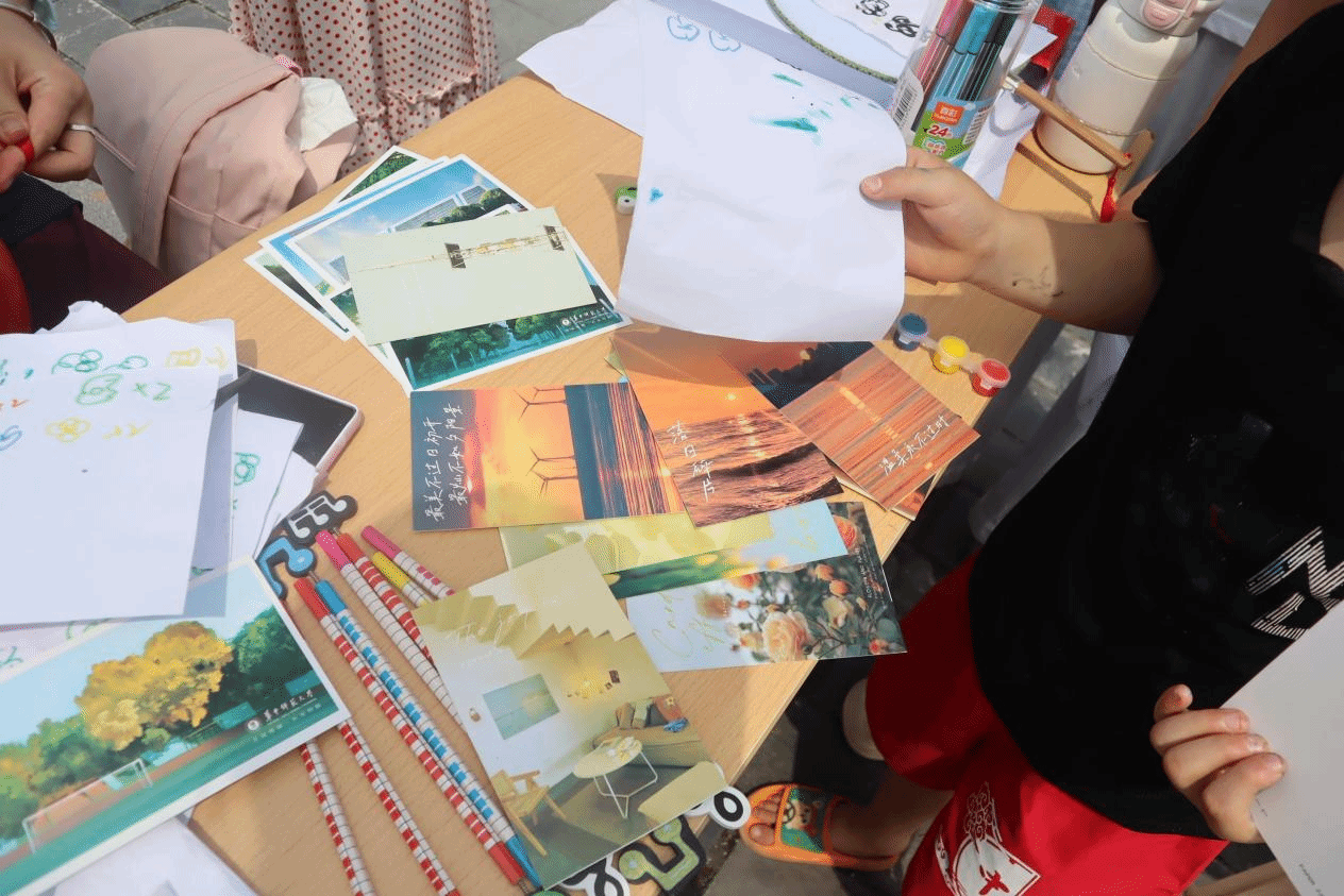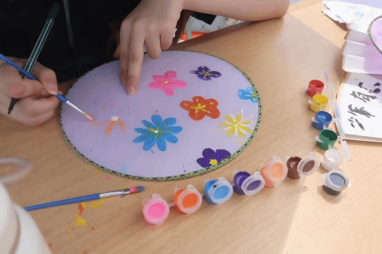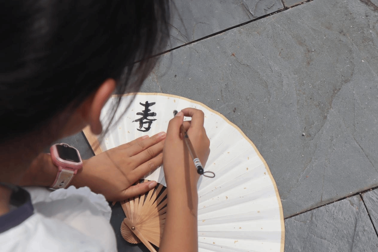 折扇始于宋代,集书画、雕刻等艺术于一体。孩子们提笔蘸墨,在扇面书写祝福或小诗,于笔墨香中感受传统文化魅力,提升书法与文学素养。短短两小时,百余把折扇完成 “变身”,整齐陈列的成品成了游园会里一道亮眼风景。