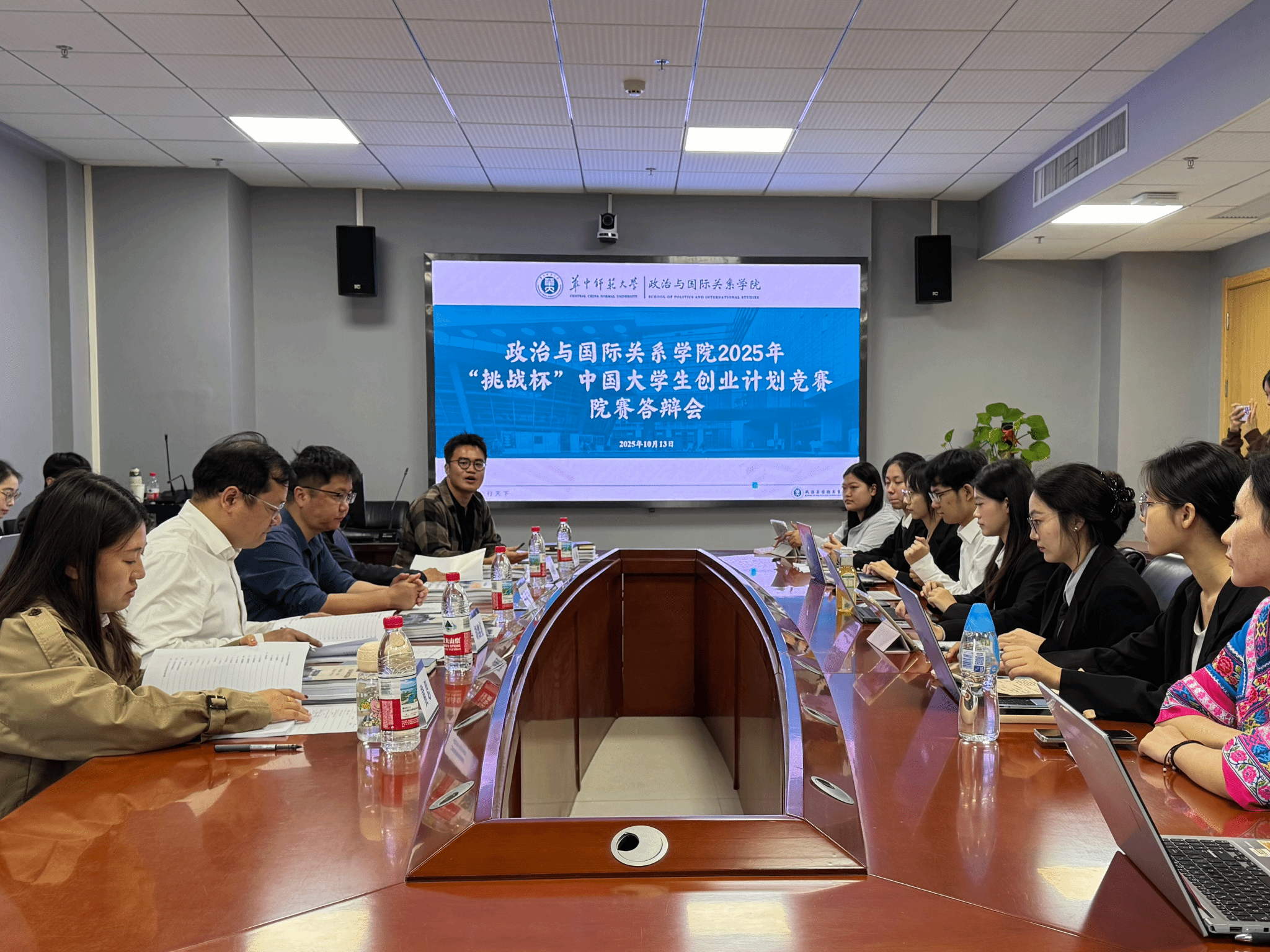 华大青年讯(通讯员 伍幸琳)10月13日,政治与国际关系学院(以下简称“政国”)2025年“挑战杯”中国大学生创业计划竞赛院赛答辩会于文科科研楼南楼917会议室开展。政国院教授陈荣卓、张必春,老师黄思,经济与工商管理学院副教授胡继亮出席活动。答辩会议由政国院团委书记袁文林主持。