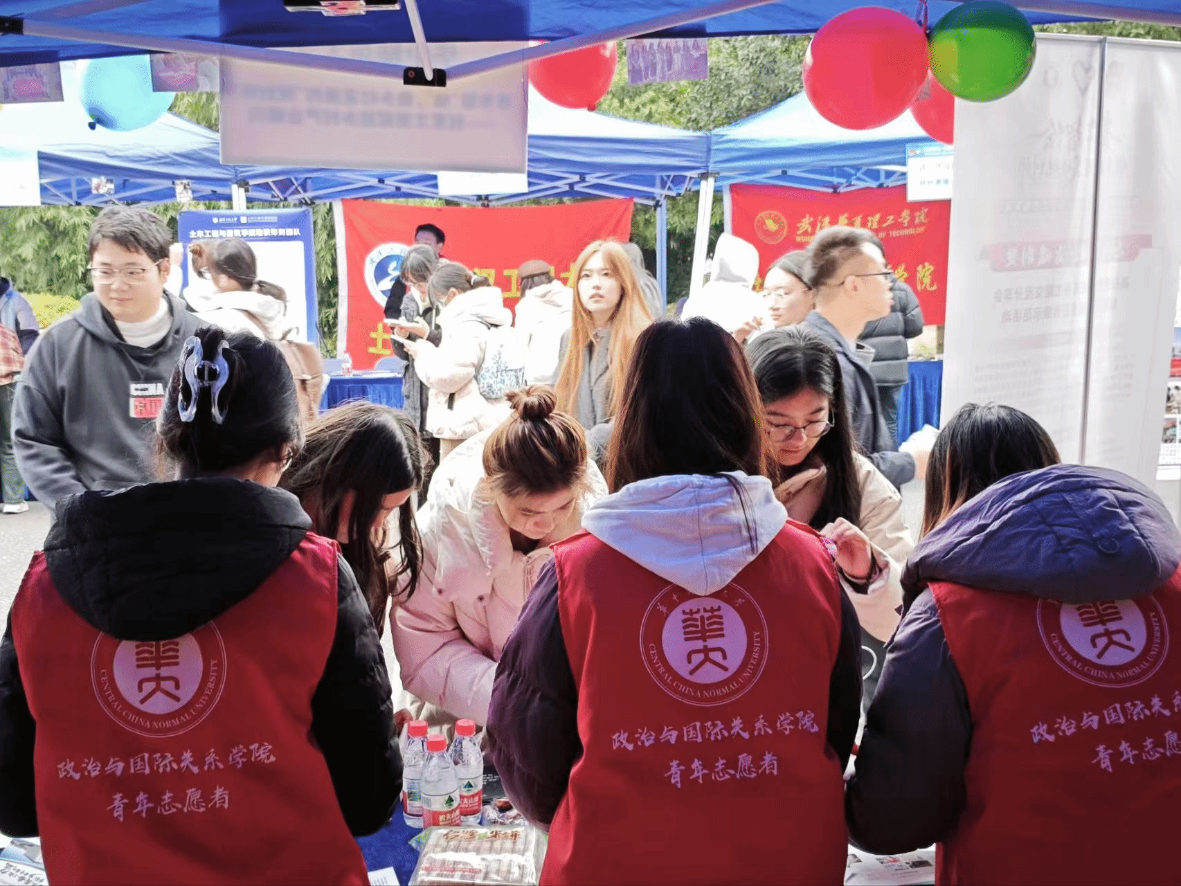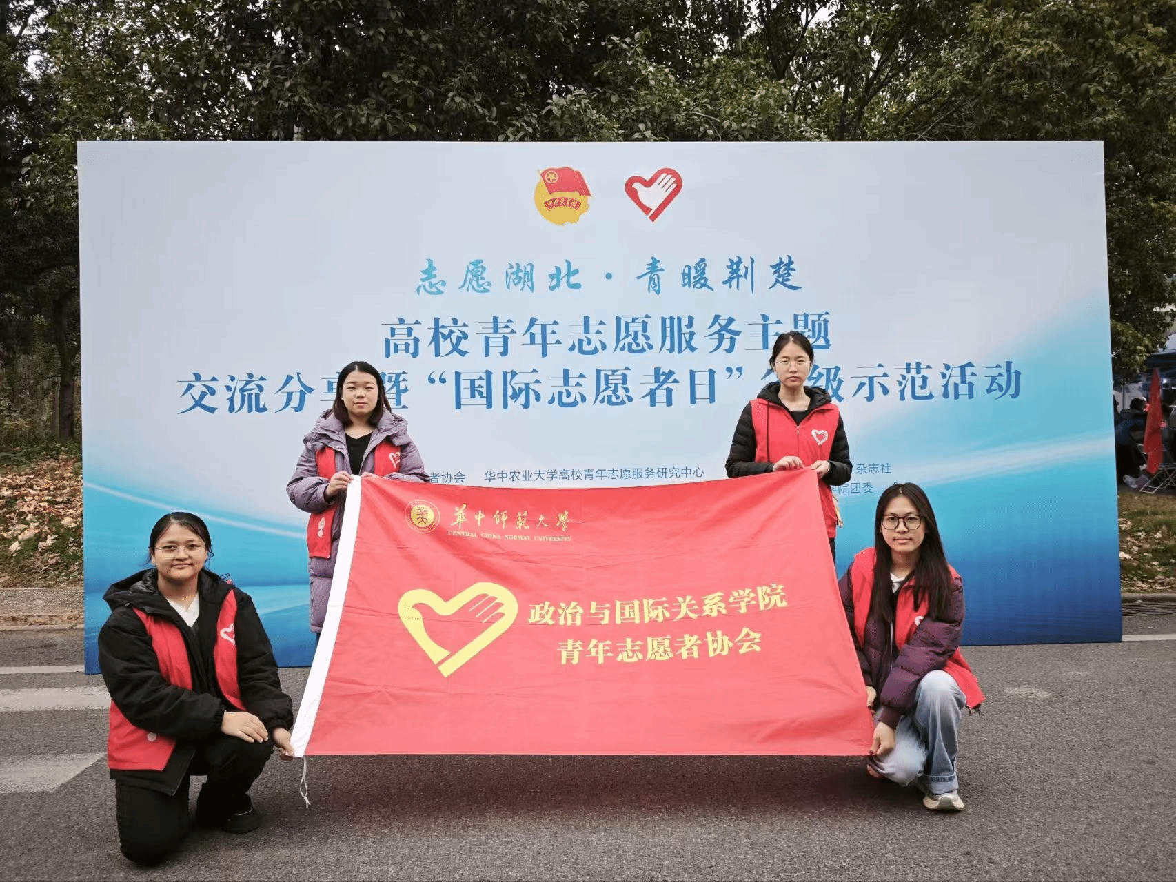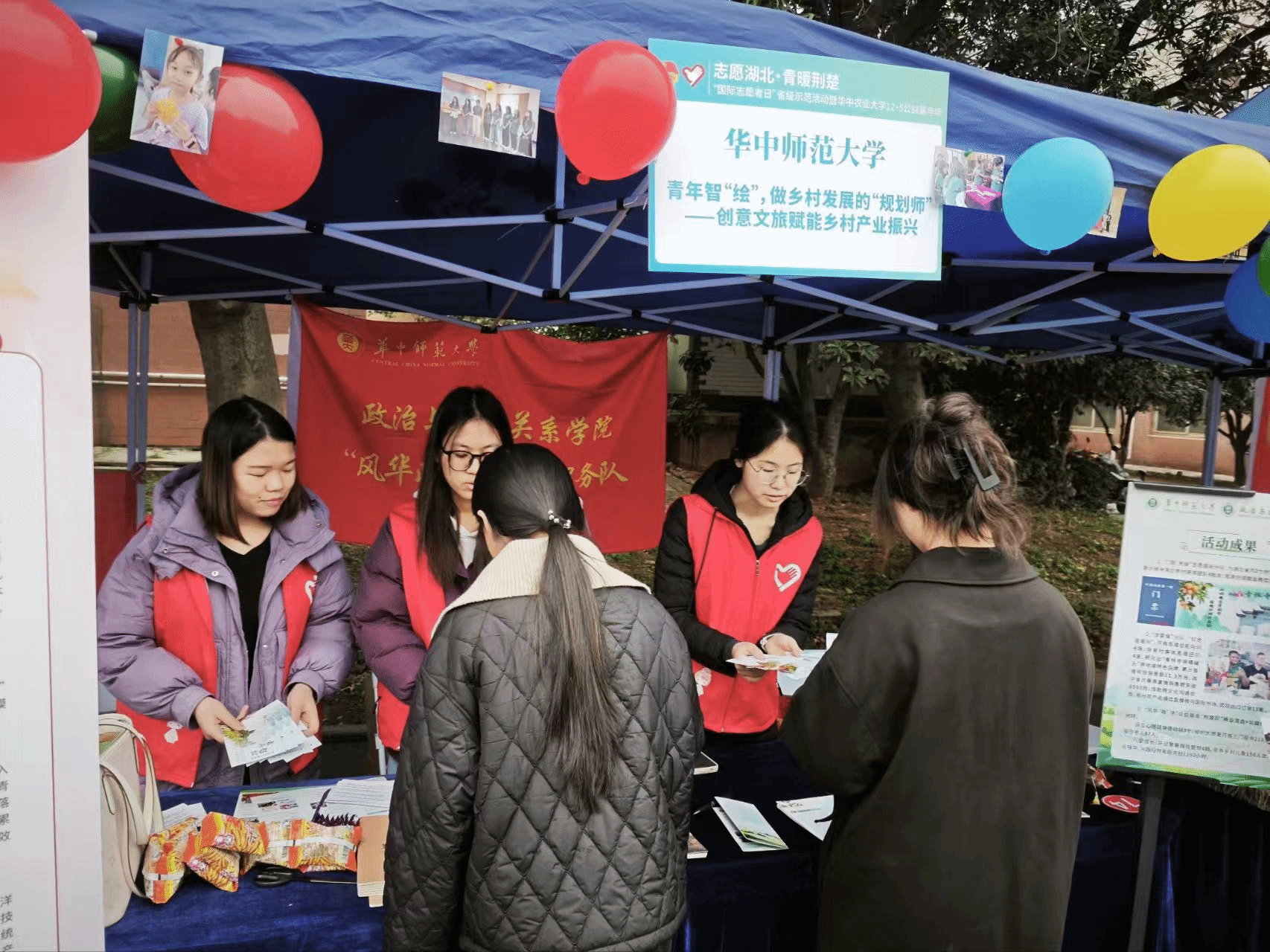 华大青年讯(通讯员 张欣语 张凯楠)12月4日下午,在第40个国际志愿者日来临之际,由省志愿者协会、华中农业大学青年志愿服务研究中心等单位主办的“志愿湖北·青暖荆楚”高校青年志愿服务主题交流分享暨“国际志愿者日”省级示范活动在华中农业大学开展。政治与国际关系学院青年志愿者协会(以下简称“政国青协”)组织8名志愿者参与本次省级志愿公益集市活动,现场推广学院乡村振兴类特色志愿服务项目,介绍风华“政”茂志愿服务队基本组织概况,同时开展主题问答互动,展现高校青年助力乡村振兴的志愿实践成果。