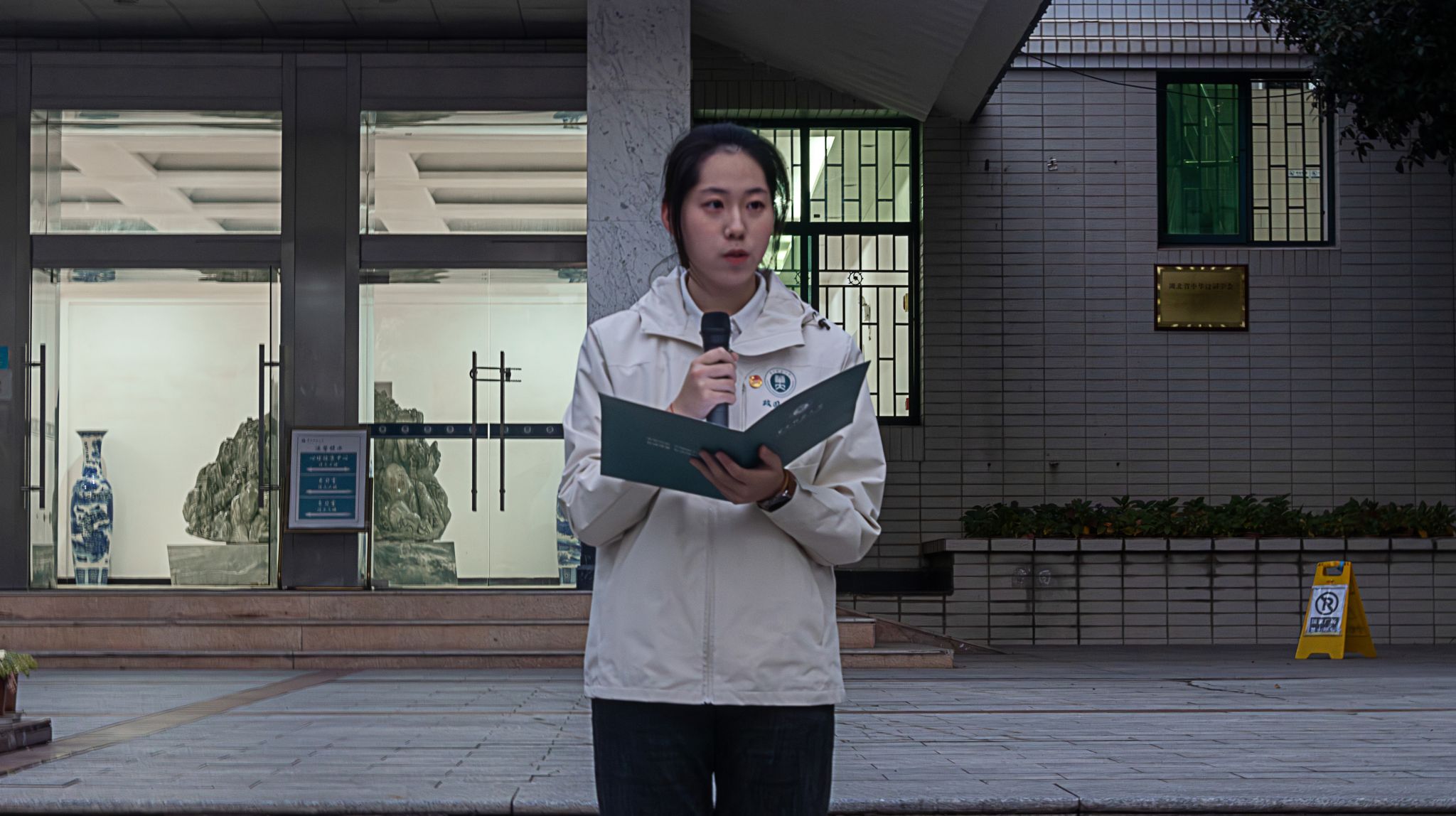学生代表、国际政治专业2023级本科生陈舒文进行国旗下发言。她呼吁同学们,要做理想信念的坚守者,从革命先辈事迹与党的创新理论中汲取力量,将个人理想融入国家事业;要做勤学笃行的实干者,兼顾“有字之书”与“无字之书”,在实践中锤炼可堪大用的本领;要做开拓创新的奋进者,以创新精神回应时代呼唤,为国家发展注入青春动能。