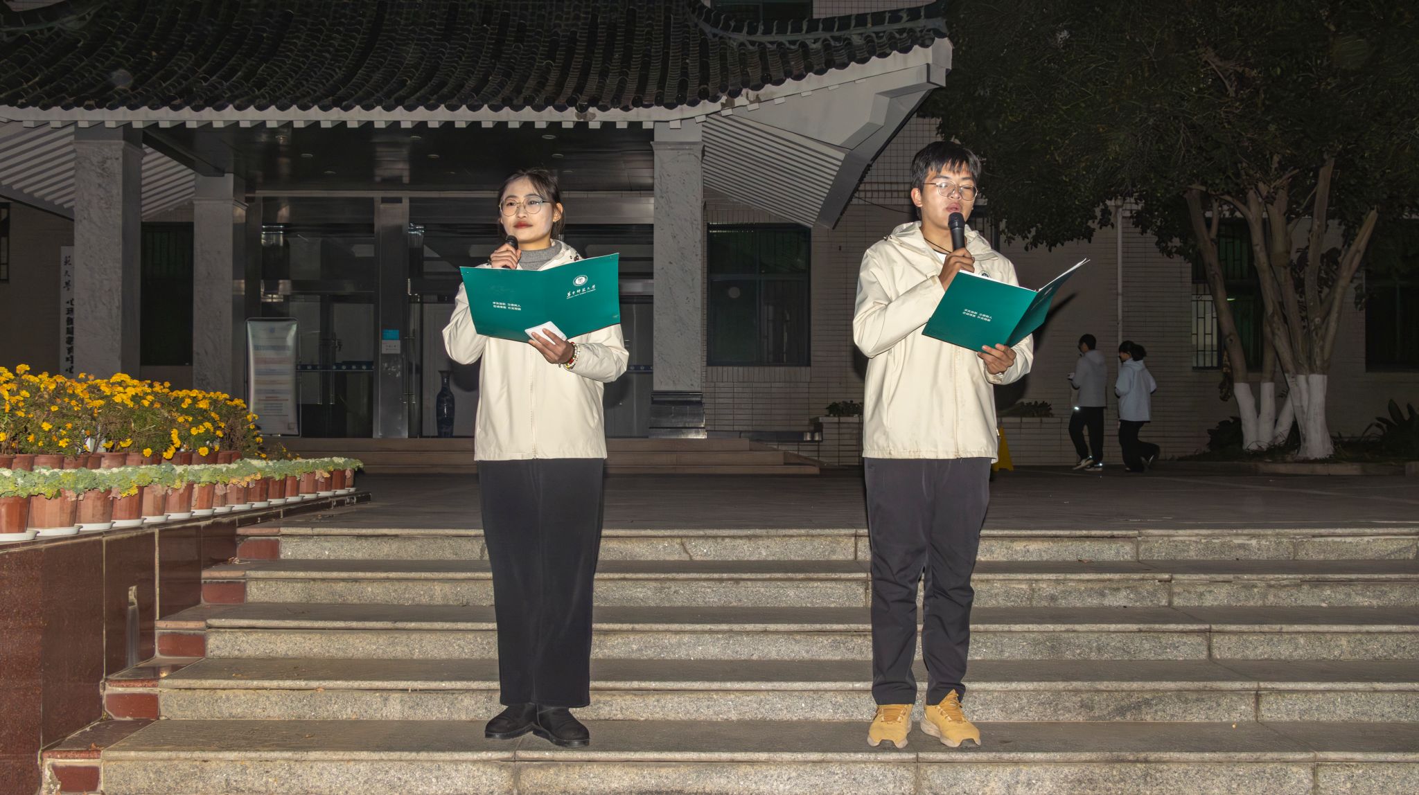 学生代表、国际政治专业2023级本科生邓芷双、陶政翰朗诵《中华颂》。二人以深情的诵读,讴歌中华民族的悠久历史与辉煌成就,激昂的诗句在升旗台前回荡。朗诵不仅讴歌了中华民族的坚韧品格与辉煌成就,更引导同学们从历史文脉中汲取养分,明白个人成长与国家发展同频共振的道理,在场师生沉浸其中,民族自豪感与爱国情怀得到进一步激发。