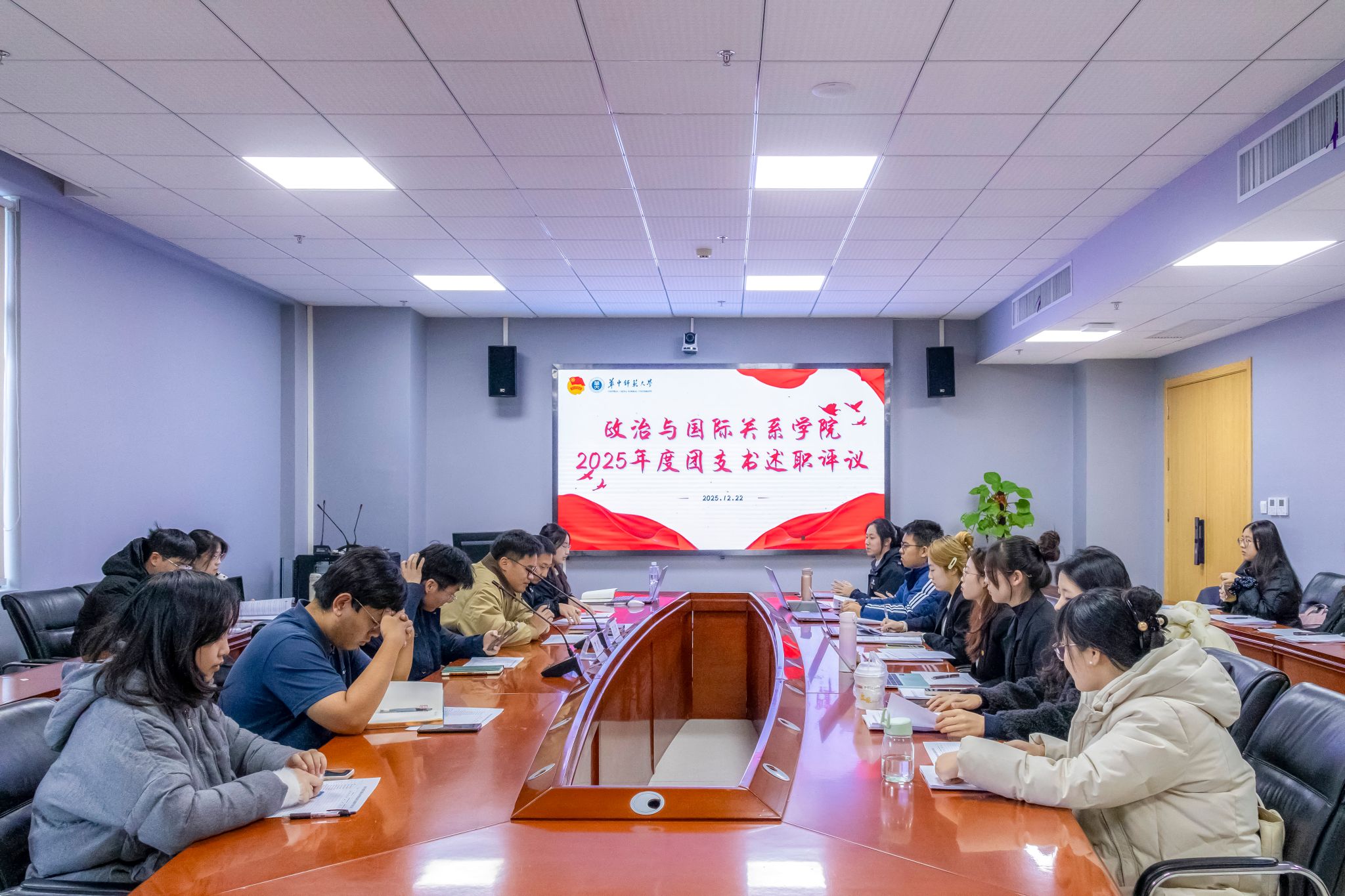 华大青年讯(通讯员 文煜涵)为全面加强基层团组织建设,系统梳理2025年工作成效与不足,进一步激发支部工作活力,12月22日,政治与国际关系学院(以下简称“政国”)团委于文科科研楼南楼917会议室召开团支部书记年度工作述职评议会。政国团委书记袁文林、团委副书记湛雨出席会议,会议由政国团委组织部部长肖颖怡主持。