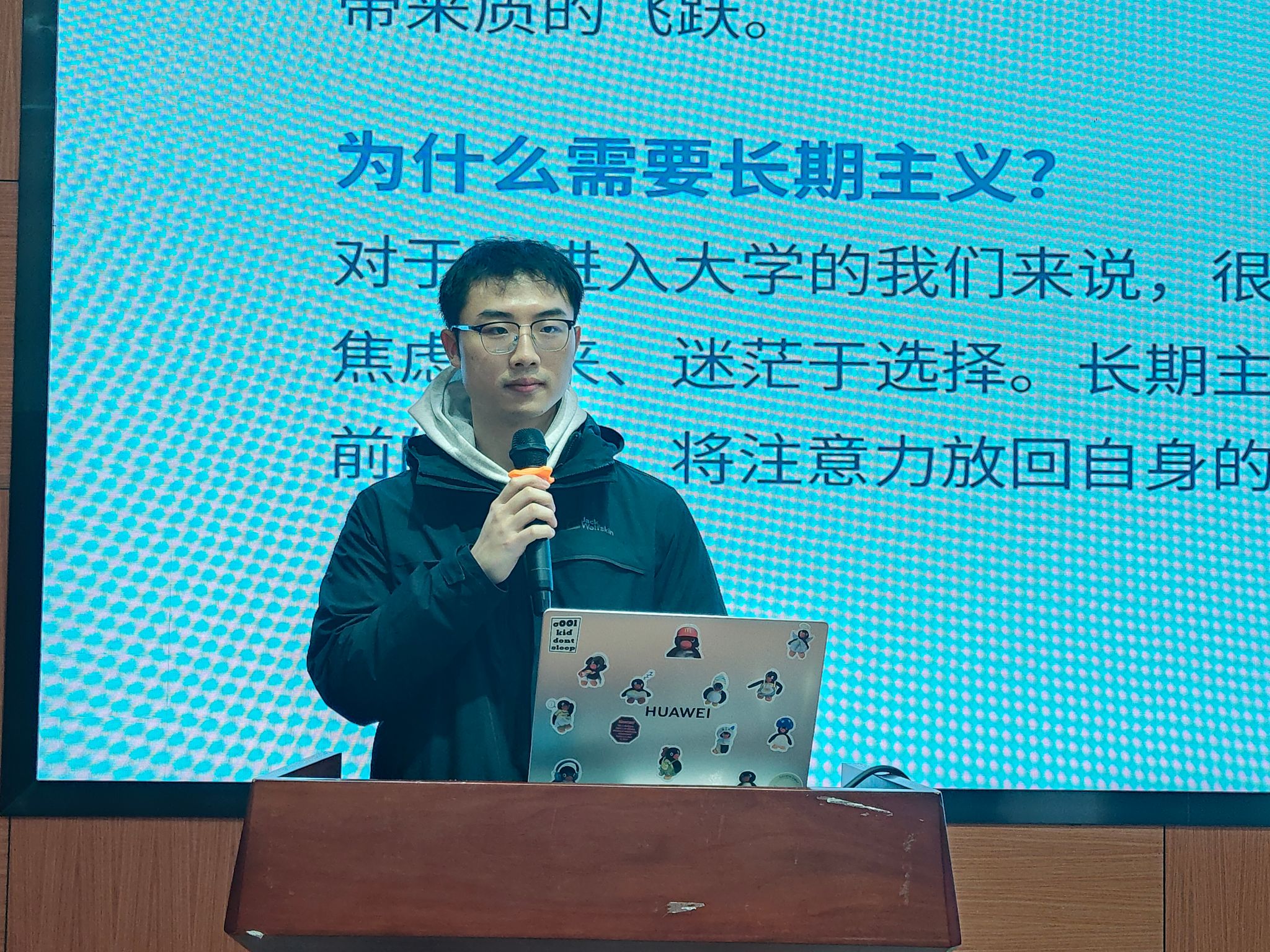 葛梓涵以长期主义为主题,从长期主义的内涵与践行长期主义的路径入手,结合自己的实践经验,向同学们介绍了重要学习方法。一是阅读经典,撰写读书笔记,丰富名著经典积累,培养学术思维;二是自主进行经验训练,将课本知识融入田野、社会,在实践中实现自我提升。
