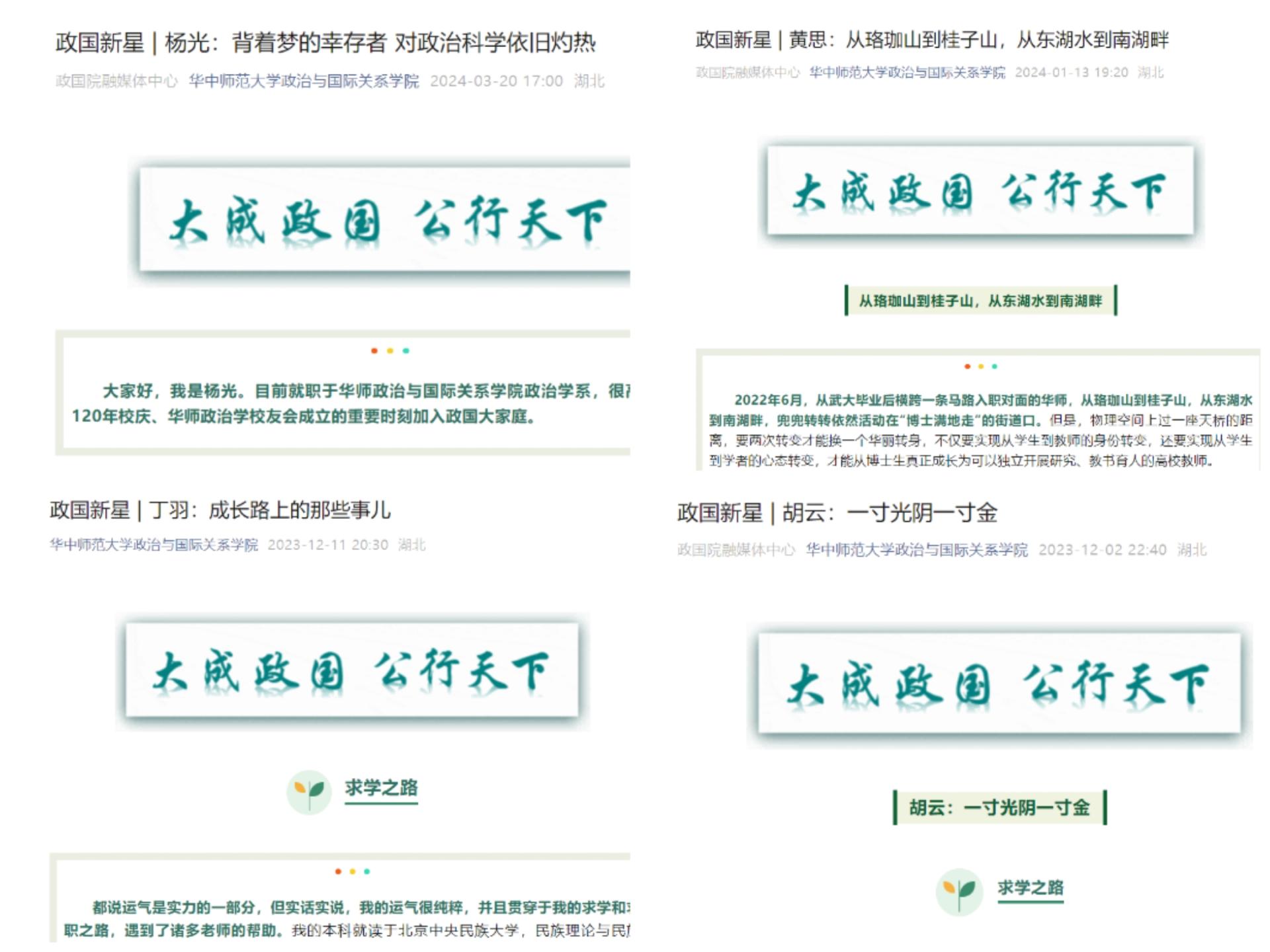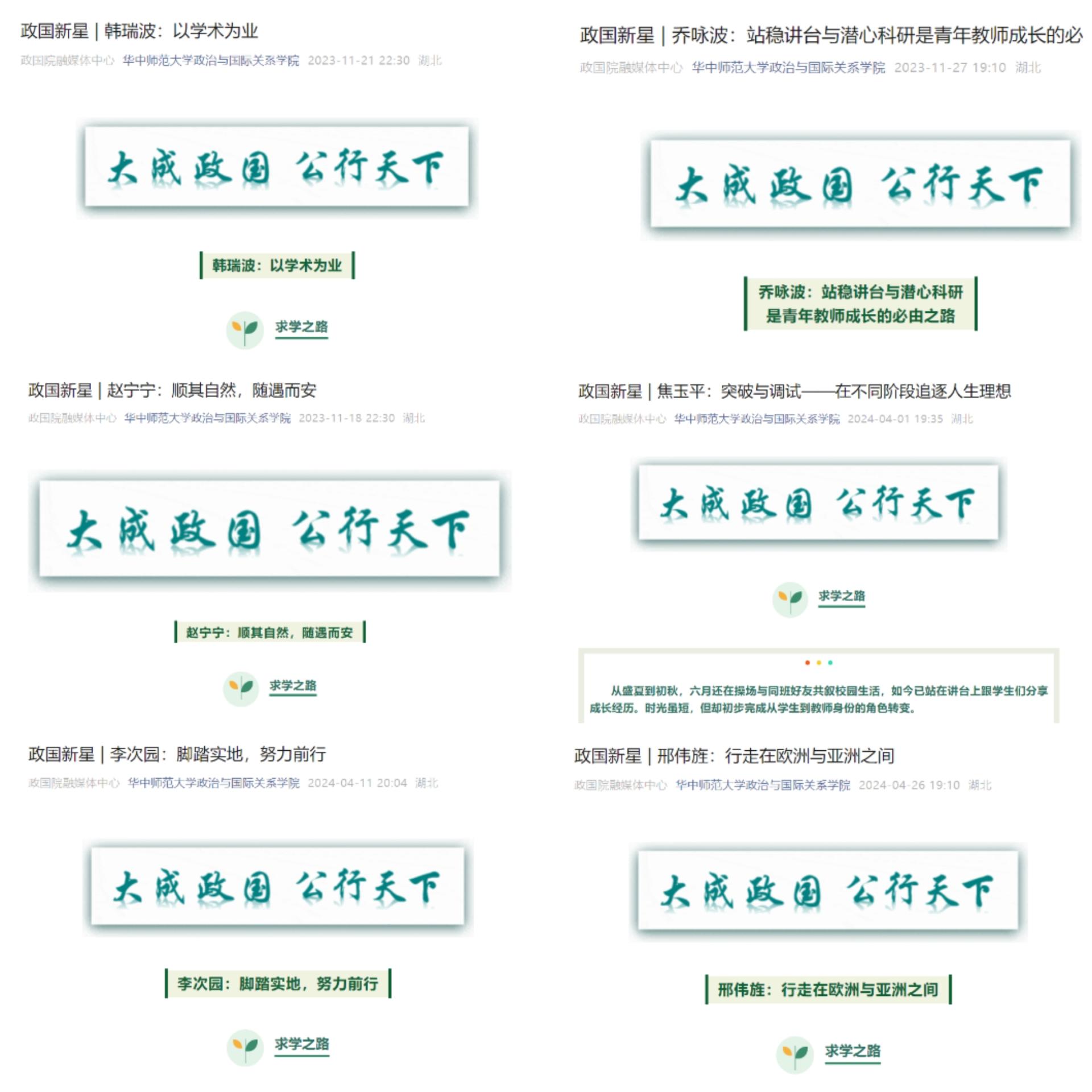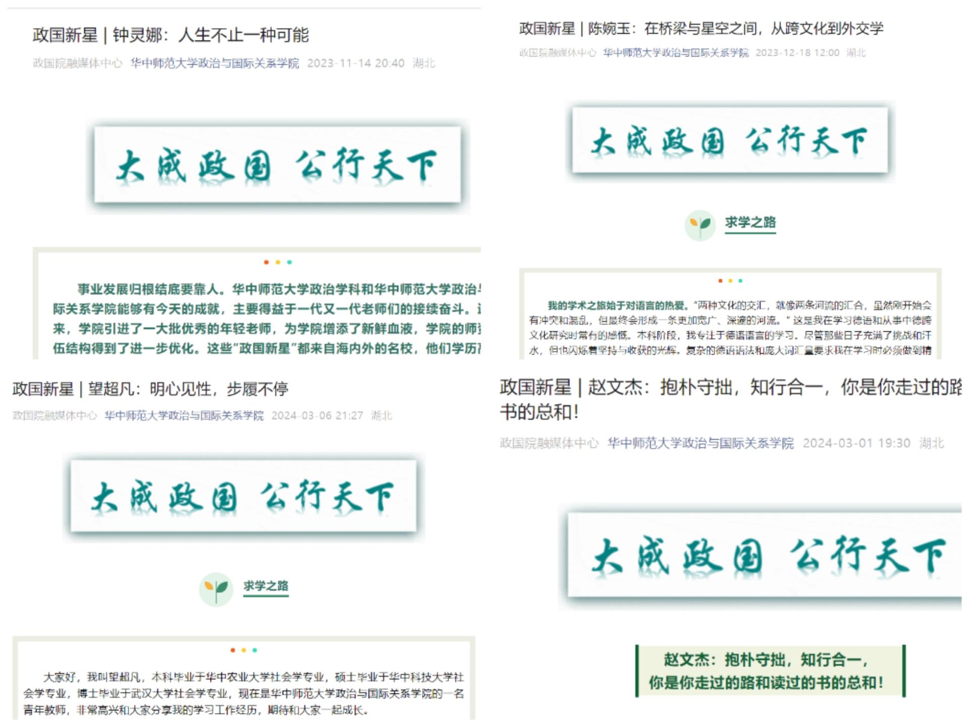 华大青年讯(通讯员 蒋佩霈)为了推进学风建设,营造良好的育人氛围,政治与国际关系学院(以下简称“政国”)微信公众号推出“政国新星”栏目,邀请学院“85后”优秀青年教师讲述自身求学、工作经历。该栏目不仅加深了广大师生校友对青年教师的认识,更让学生对求学和治学、进取与成长有了更深刻的理解,取得了良好的学风建设促进效果。