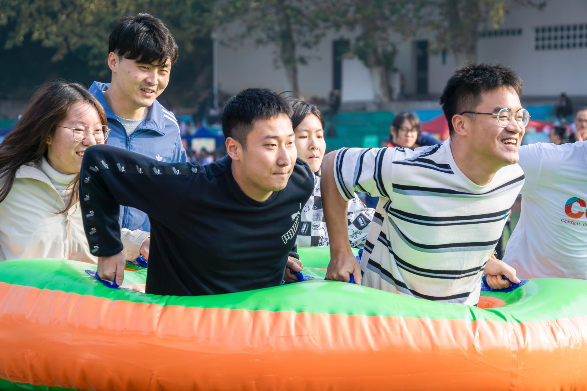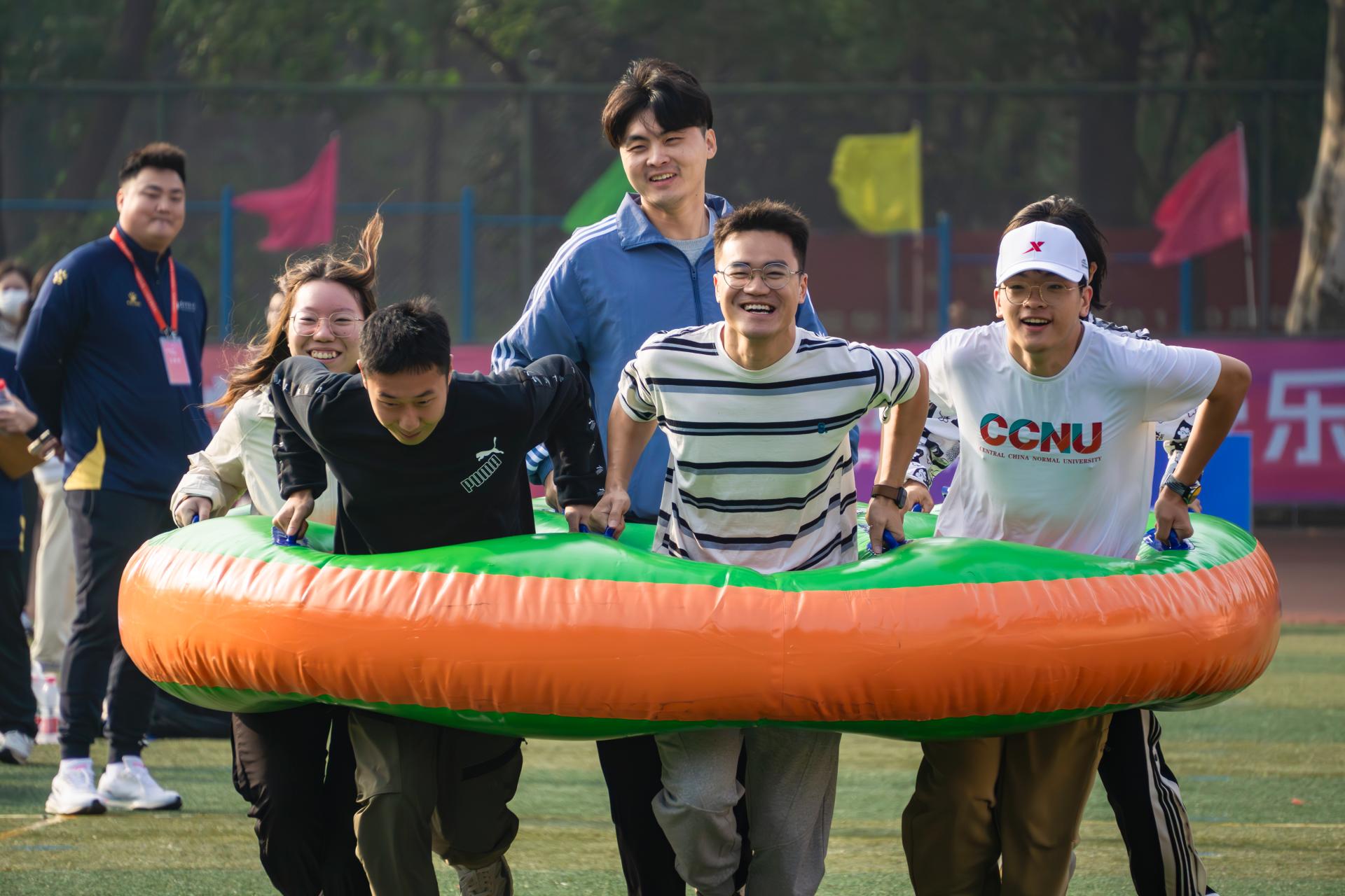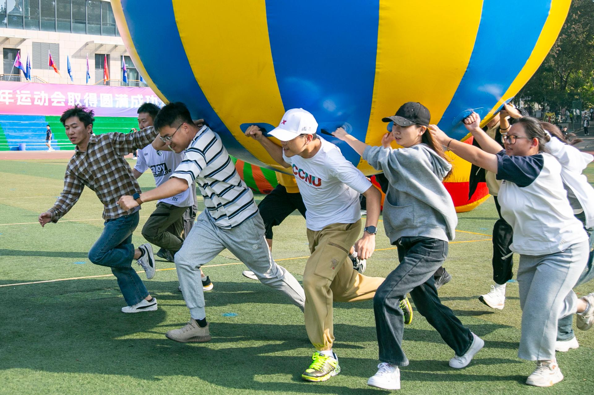 政国教工组共参加披萨战士与运转乾坤两场比赛。披萨战士比赛共六人参加,参赛教职工钻进道具披萨内一起通过终点。运转乾坤比赛共十人参加,参赛的老师们共同托举大球在指定赛道内向前推进至终点。这不仅考验了团队协作能力,也为运动会增添了趣味元素。