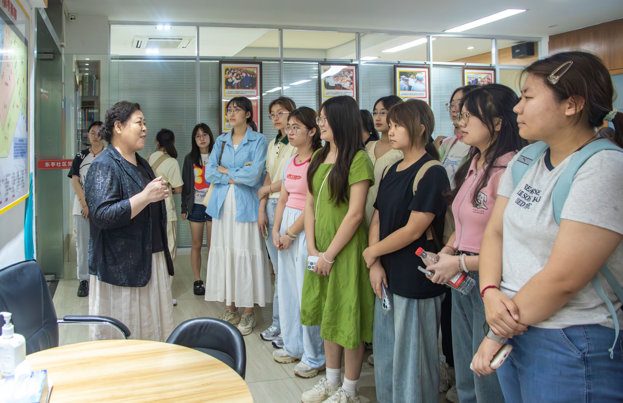 在东亭社区,社区党委书记王学丽带领实践队队员深入了解了社区在服务居民等方面的优秀做法。王学丽详细介绍了社区如何通过党建引领,有效提升居民的幸福感和获得感。参观过程中,队员们深入考察了该社区“多元共治”创新模式,深切体会到党建引领基层治理的强大效能,也更加明晰了青年学生参与社会建设、服务群众的责任与路径。