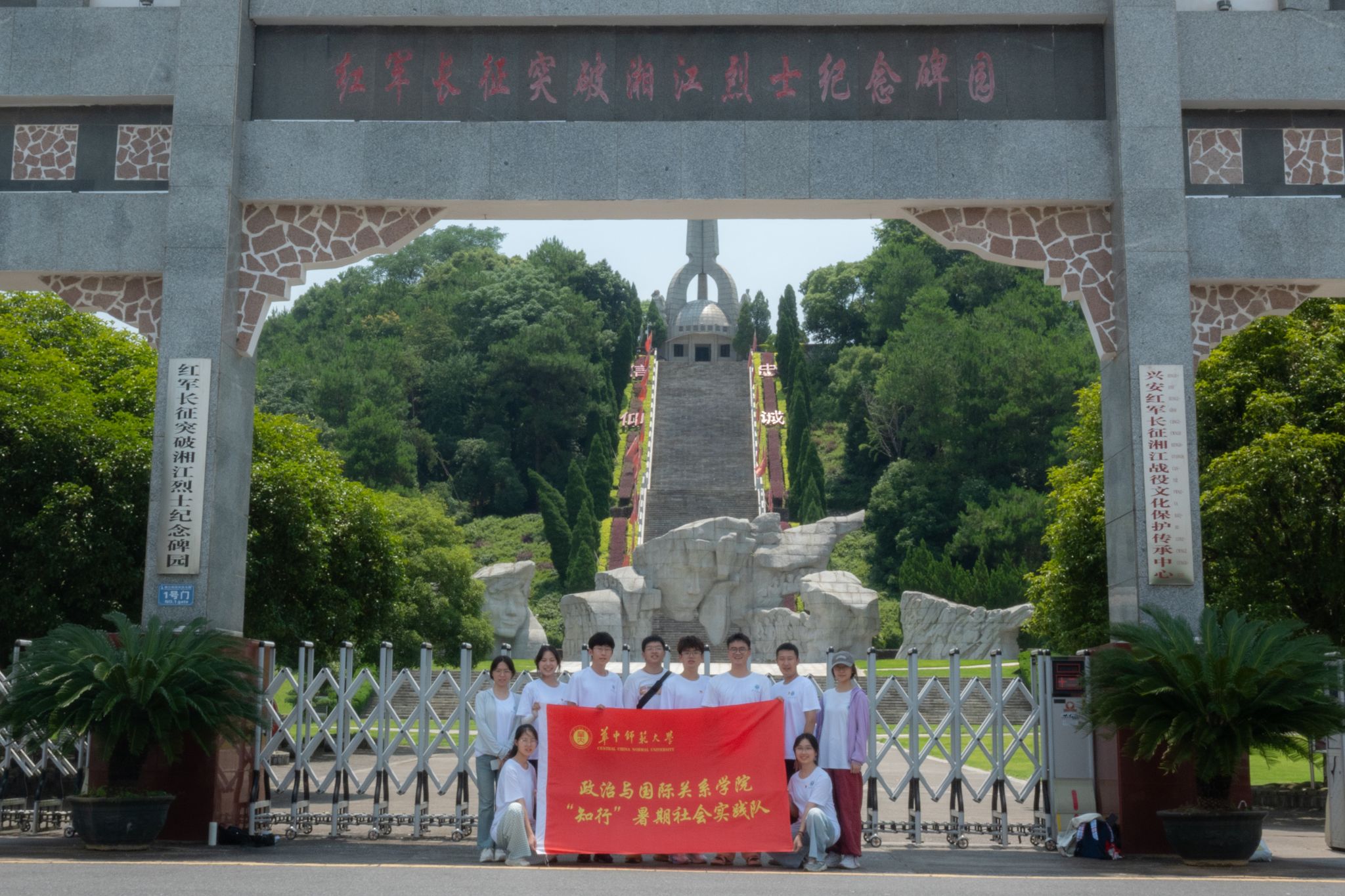 华大青年讯(通讯员 魏司晨)7月6日,在政治与国际关系学院(以下简称“政国院”)团委书记、本科生辅导员袁文林的带领下,政国院“知行”社会实践队“重走长征路”分队抵达兴安,继续开展“重走长征路”社会实践。实践队先后参观了红军长征突破湘江烈士纪念碑园、纪念馆及千家寺红军标语楼等红色遗址,并重走龙潭江景区的红军桥、红军路。通过实地参观和亲身体验,成员们深刻感悟到红军将士“勇于胜利、勇于突破、勇于牺牲”的革命精神,对湘江战役的历史意义有了更深入的认识。