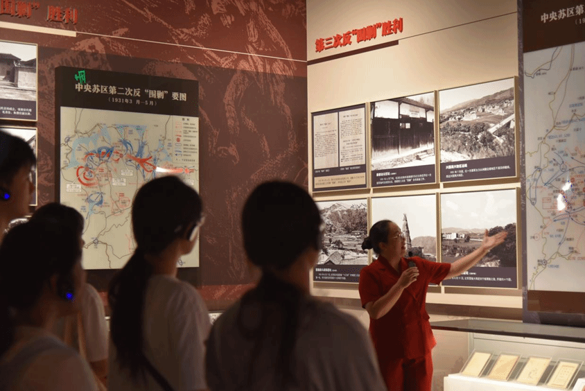 上午,队员们走进中华苏维埃共和国历史纪念园。推开厚重的大门,序厅巨幅浮雕《人民共和国从这里走来》呈现在眼前——铁锤镰刀、稻穗步枪,沉默却铿锵,同学们沿着时间轴线缓步前行,从“八一”起义枪声,到“一苏大”的庄严宣告;从《土地法》的墨迹,到“借谷证”“公债券”的细痕,一件件文物把90年前的治国理政细节拉到眼前。讲解员将1931年11月“一苏大”召开等历史场景徐徐展开,同学们屏息聆听,在“土地法”“劳动法”展台前驻足,触摸苏维埃政府“真心实意为人民谋利益”的初心。