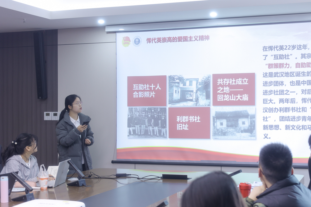 3月10日,首场研学会在文科综合楼四楼一号会议室召开。讲师团各小组代表围绕恽代英精神、青年担当、乡村振兴等主题进行宣讲展示,全体成员交流备课经验,并相互提出建议。