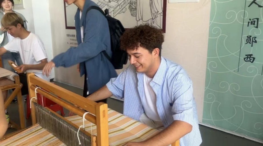 东南大学阿卜杜萨比尔·叶木江同学体验织布文化。
