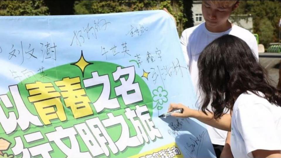 高校大学生在文明旅游旗帜上签名